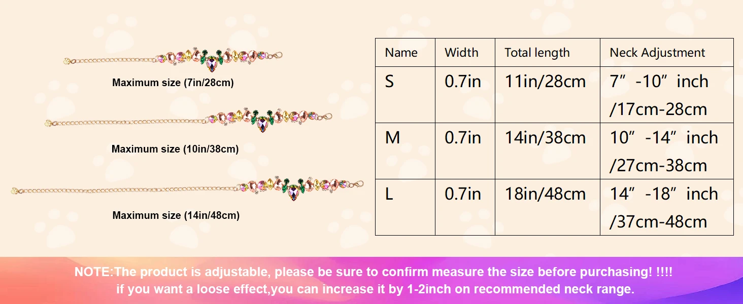 Adjustable Size of Dog Cat Collar:The yellow diamonds cat chain necklace width is 0.27 inches, you can choose three sort of length . Respectively are 7 inches, 10 inches, 14inches and the length of the extension chain is 11cm (about 4.3 inches), You can extend it to the length you need, and then adjust collar to fit the neck of most cats and dogs.