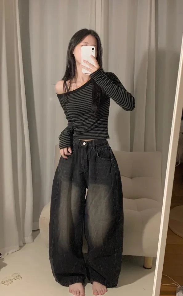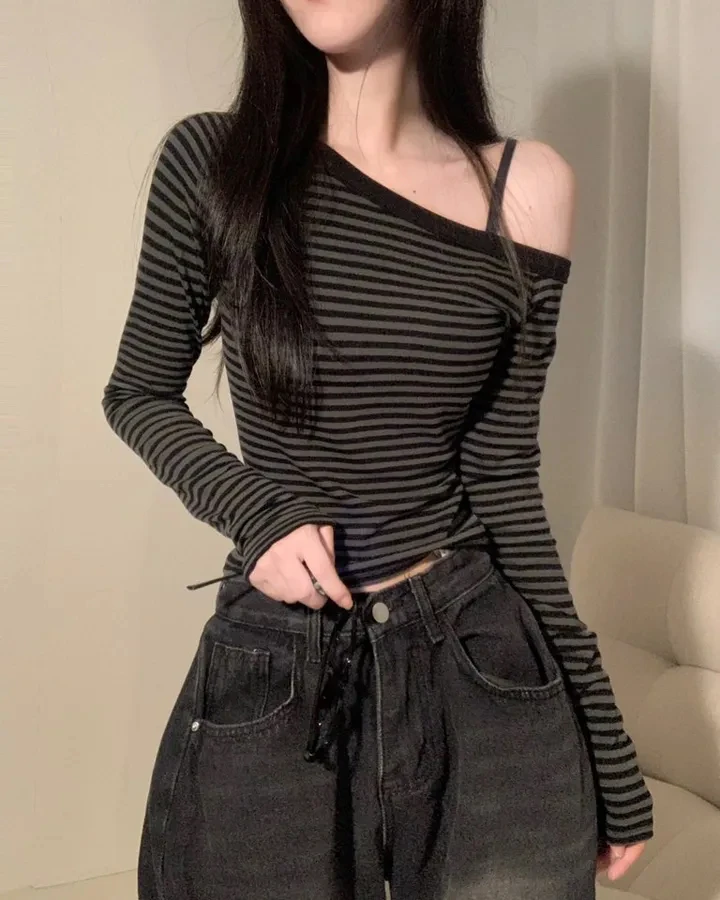 Embrace the latest Korean fashion trend with this stylish striped long-sleeve T-shirt, perfect for the 2025 autumn season.